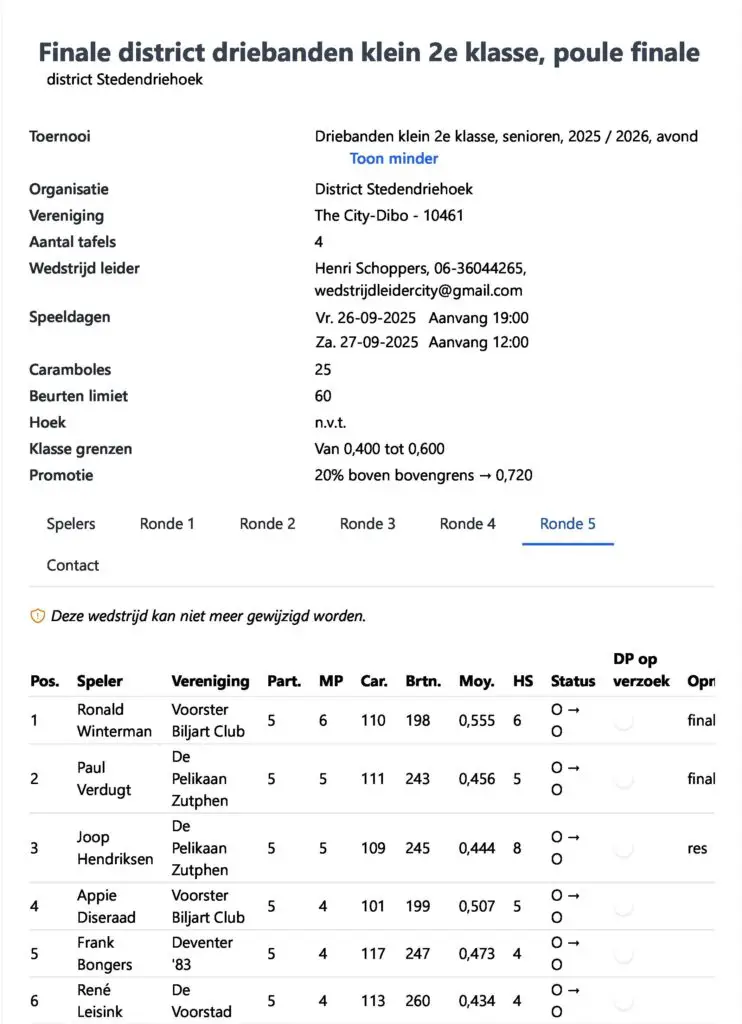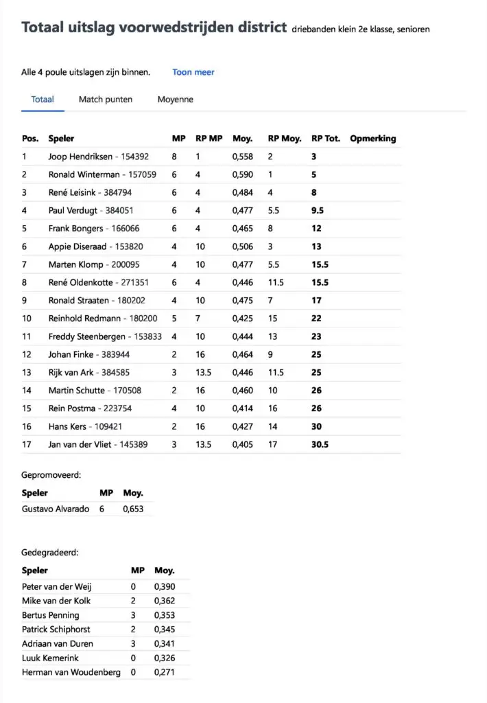 Totaal Uitslag Voorronden Driebanden 2e klas