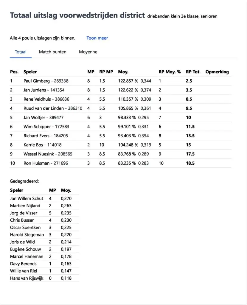 Totaal Uitslag Voorronden Driebanden 3e klas